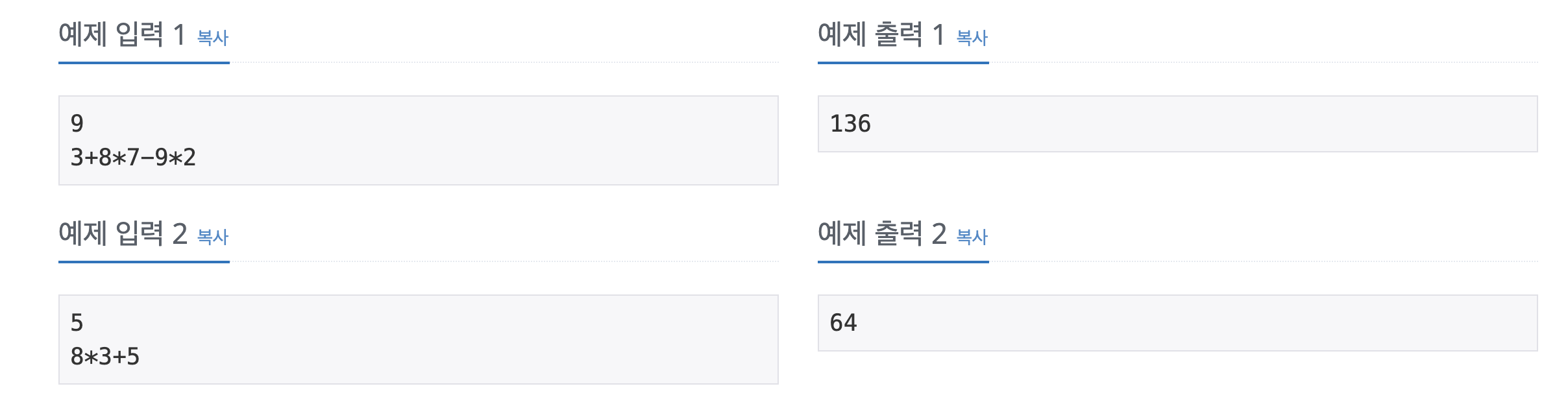 사실 처음에는 괄호를 어떻게 처리해야 할 지 감이 잘 오지 않았다. 그 이유는 수식 앞에서 부터 순서대로 괄호를 넣는 케이스를 예시로 생각했었고 아래와 같이 앞에서 부터 케이스별로 괄호를 넣을 수 있는 방법을 구현하려고 하니 복잡하고 잘 떠오르지 않아서 많이 헤맸다.