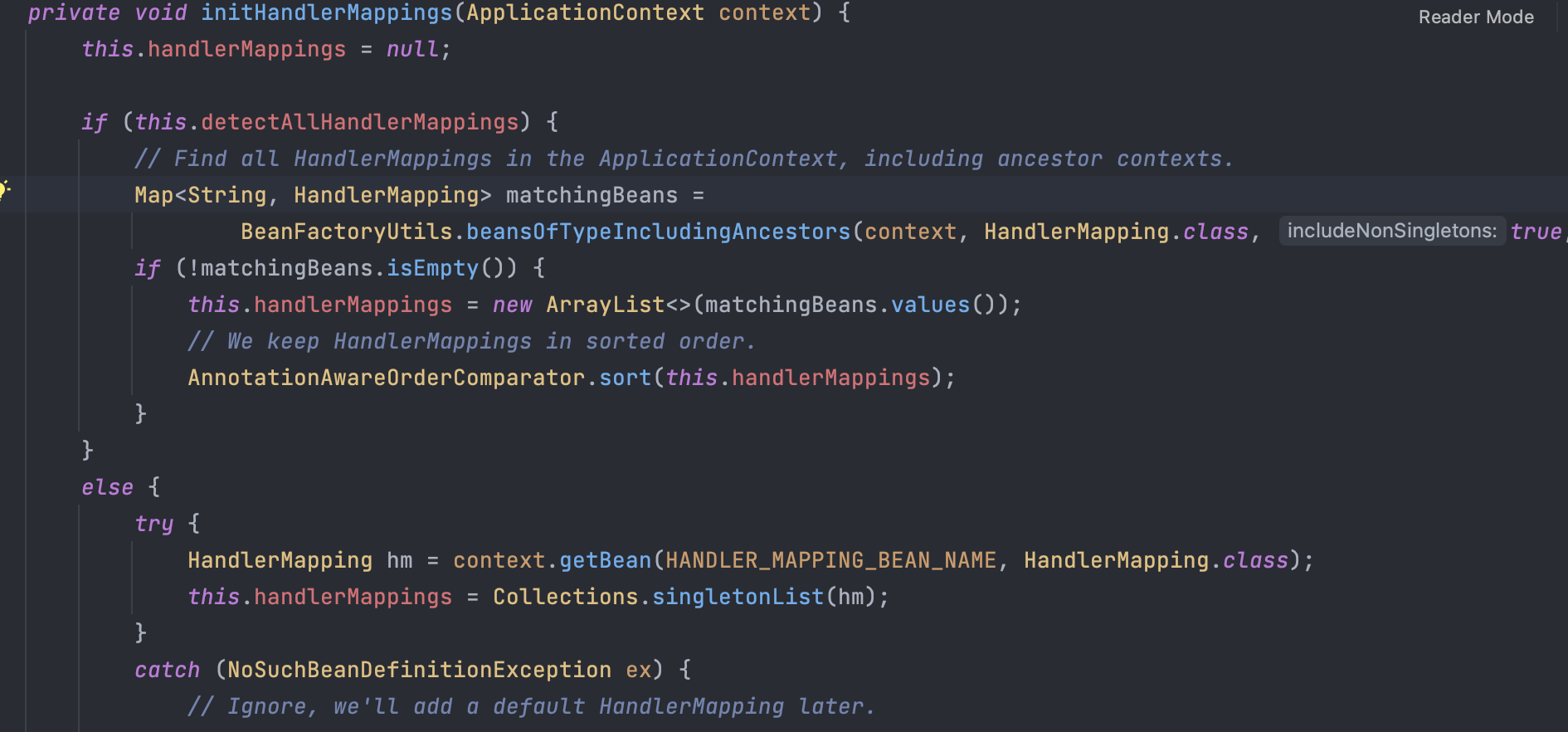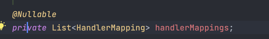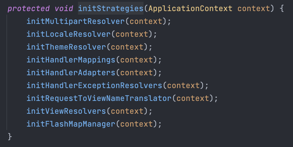 위 코드는 dispatcherServlet 코드의 일부분이다. 위 initStrategies 메서드에서 각종 요소들을 초기화 해주는 작업을 진행하는데, 이 중 initHandlerMappings 라는 메서드를 호출하는 것을 알 수 있다. 사실 우리가 스프링 빈으로 등록하여 사용하는 컨트롤러나 , 스프링 내부적으로 등록되어 있는 컨트롤러등 많은 컨트롤러들이 HandlerMaping 객체로써 initHandlerMappings 라는 메서드를 통해 handlerMappins라는 리스트에 담기게 된다.