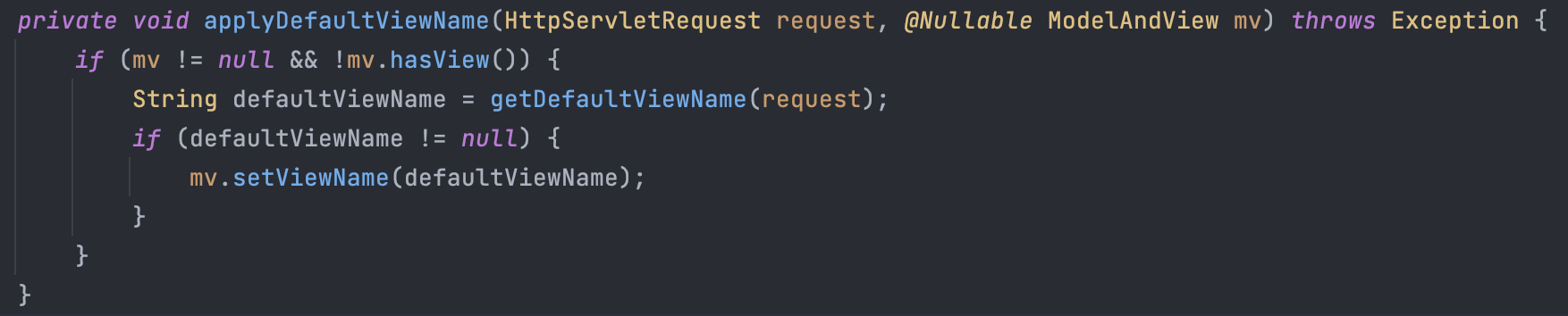 렌더링하기 전에 applyDefaultViewName() 메서트를 통해 view resource 의 경로를 얻고, ModelAndView 객체에 세팅해준다.