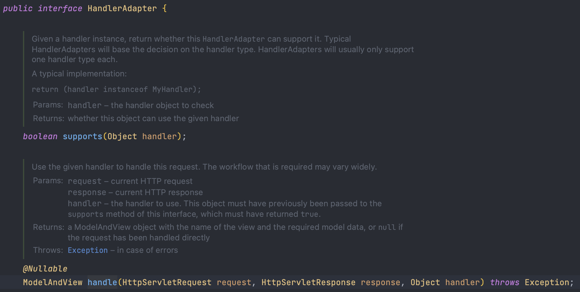 참고로 HandlerAdapter 인터페이스를 살펴보면 HandlerAdapter를 구현한 구현체들은 supports(), handle() 메서드를 구현해야한다.