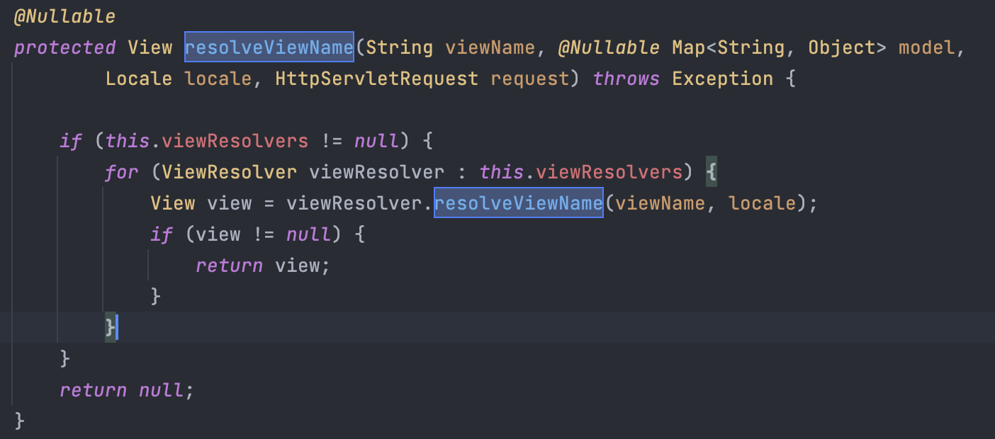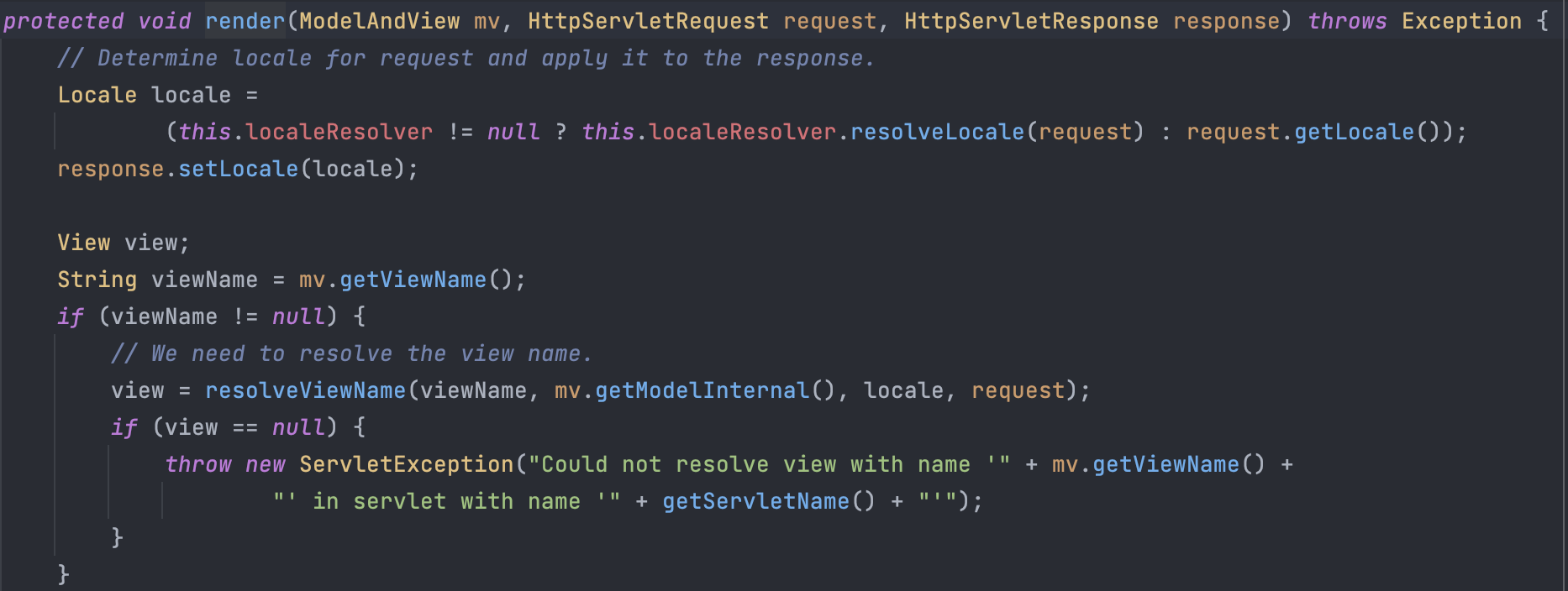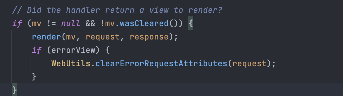 이렇게 경로를 세팅해 준 뒤 비로소 processDispatchResult() 메서드를 통해 아래 코드의 순서로 뷰가 렌더링 된다.