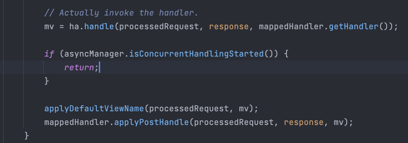 이후 dispatcherServlet의 doService -> doDispatch 를 통해 요청에 맞는 핸들러를 찾고 (아래 코드의 getHandler()에서) , 해당 핸들러를 다룰 수 있는 어댑터(아래 코드의 getHandlerAdapter() 에서)를 찾고 우리가 구현한 컨트롤러의 로직이 핸들러 어탭터를 통해 실행되는 흐름이다.